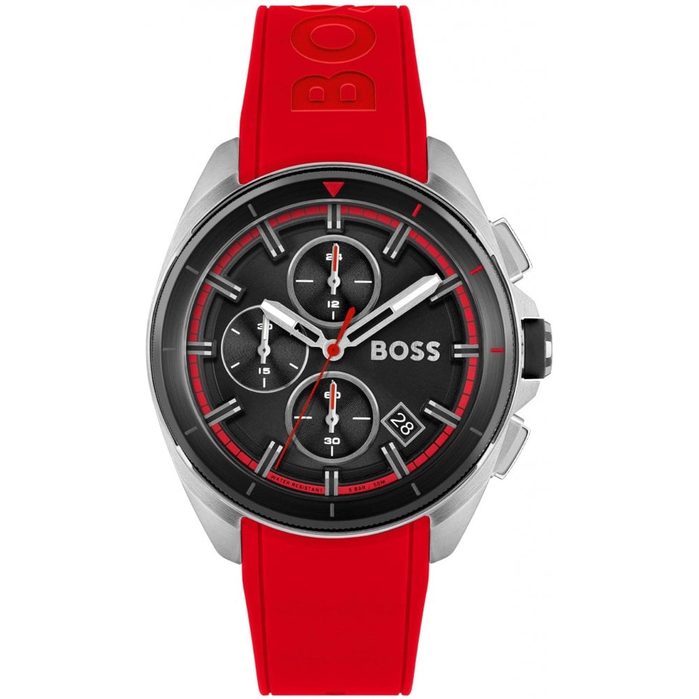 Hugo Boss HB 1513959 Volane Watch is een bijzonder herenhorloge. De kast is gemaakt van roestvrij staal en de kleur van de wijzerplaat is zwart. Tot de kenmerken van het horloge behoort onder andere een chronograaf. Ook heeft het horloge een rode siliconen band.